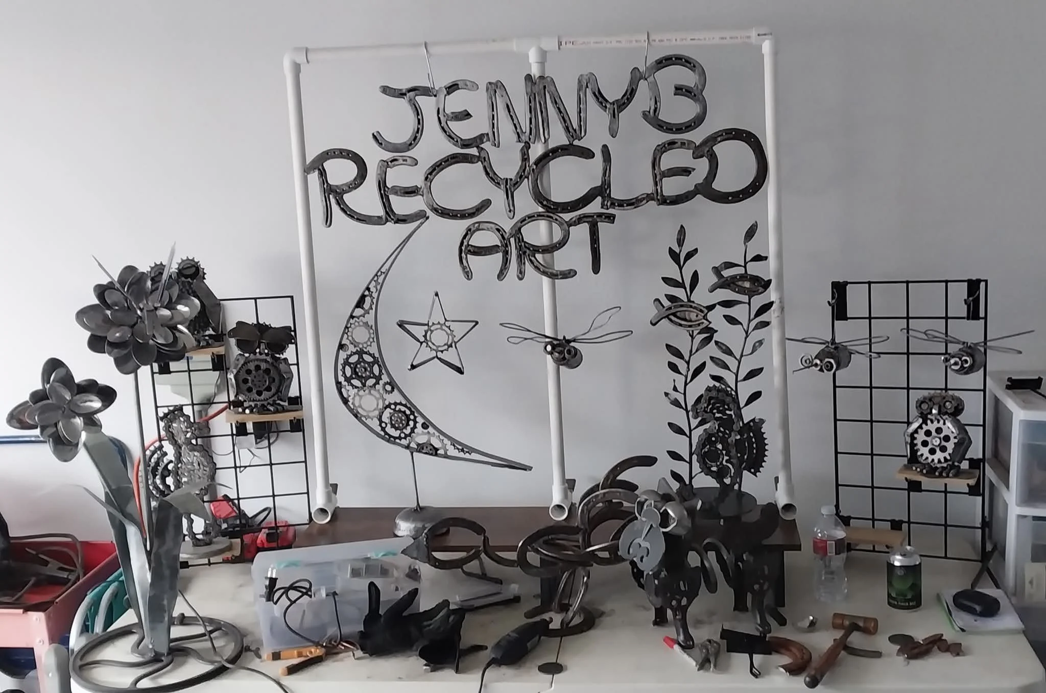Jenny B of Jenny B Recycled Art is a self-taught hobby welder who turns discarded metal into whimsical, one-of-a-kind sculptures. Working with recycled and scrap materials, she transforms what others toss aside into playful, personality-packed pieces that bring joy and character to homes and gardens.