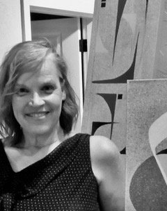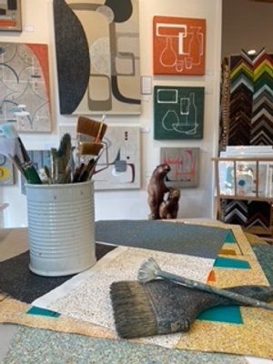 geometric and organic shapes with fluid strokes of acrylic paint.